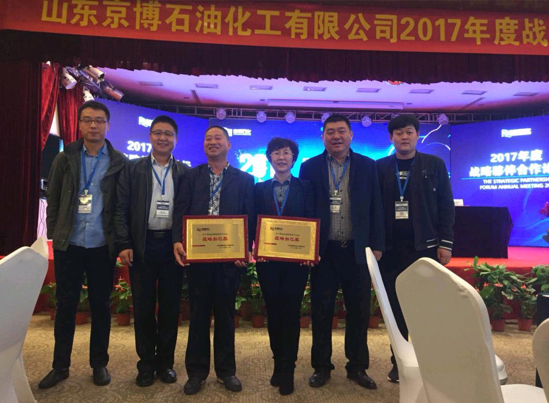 山東京博石油化工有限公司與撫順機(jī)械設(shè)備制造有限公司在2016—2017年度密切合作,總合作金額達(dá)3000萬,自雙方建立戰(zhàn)略合作伙伴以來,撫機(jī)公司為京博石化提供了多種質(zhì)量優(yōu)質(zhì),產(chǎn)品高效的壓力容器設(shè)備。2017年11月4日在山東京博石化有限公司舉辦的“2017年度戰(zhàn)略伙伴合作論壇”上,撫機(jī)公司以其卓越的產(chǎn)品質(zhì)量和突出的綜合實(shí)力被京博石化光榮授予“戰(zhàn)略知己”的榮譽(yù)稱號(hào)。撫機(jī)公司副總經(jīng)理齊軍、市場部部長楊